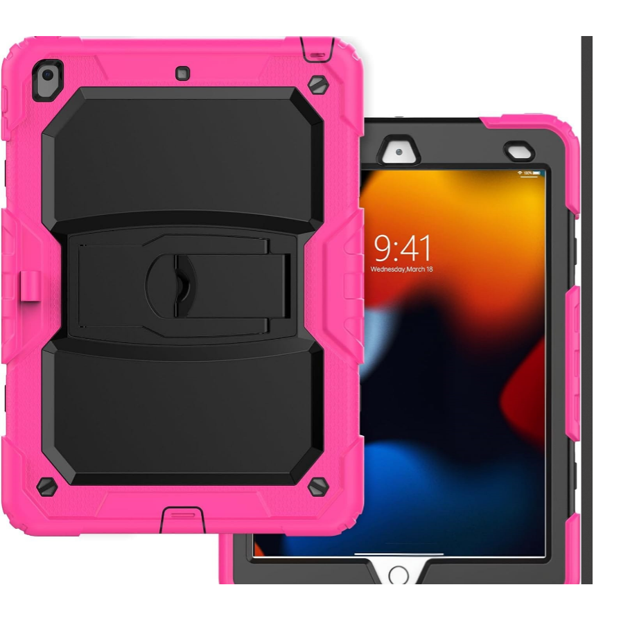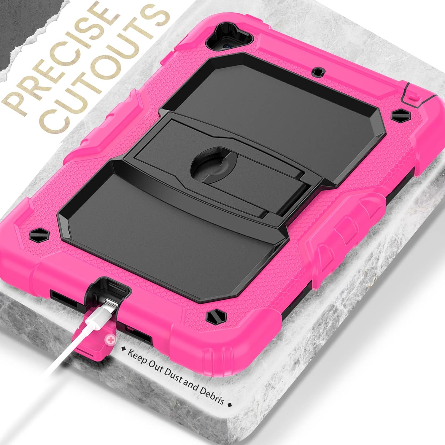 Husa Sigloo pentru iPad 9.7" (iPad 5/6, Air 2, Pro 9.7) – 3 Straturi Protectie, Suport Integrat, Ecran Protejat, Antisoc pentru Copii – Roz cu Negru