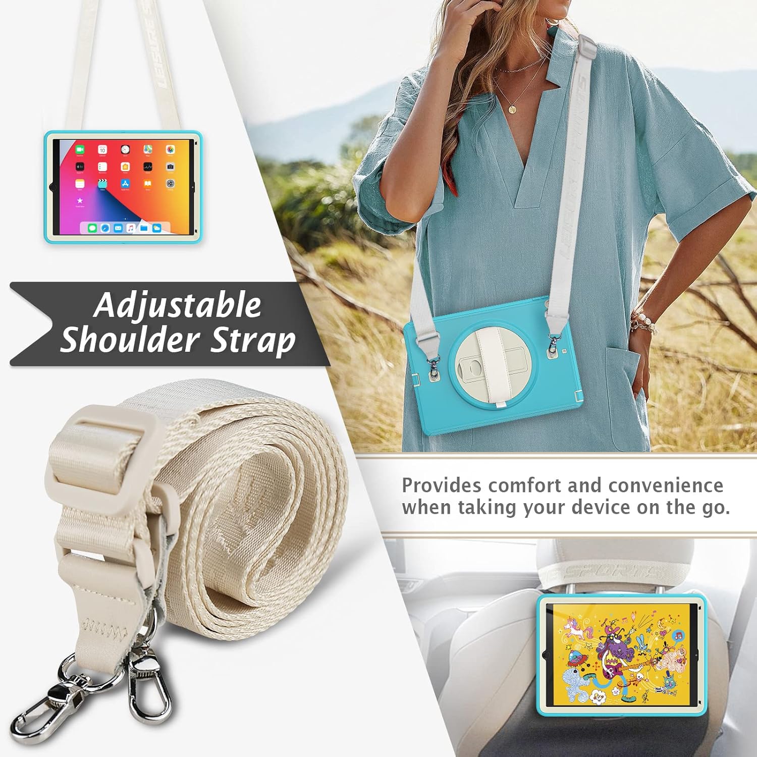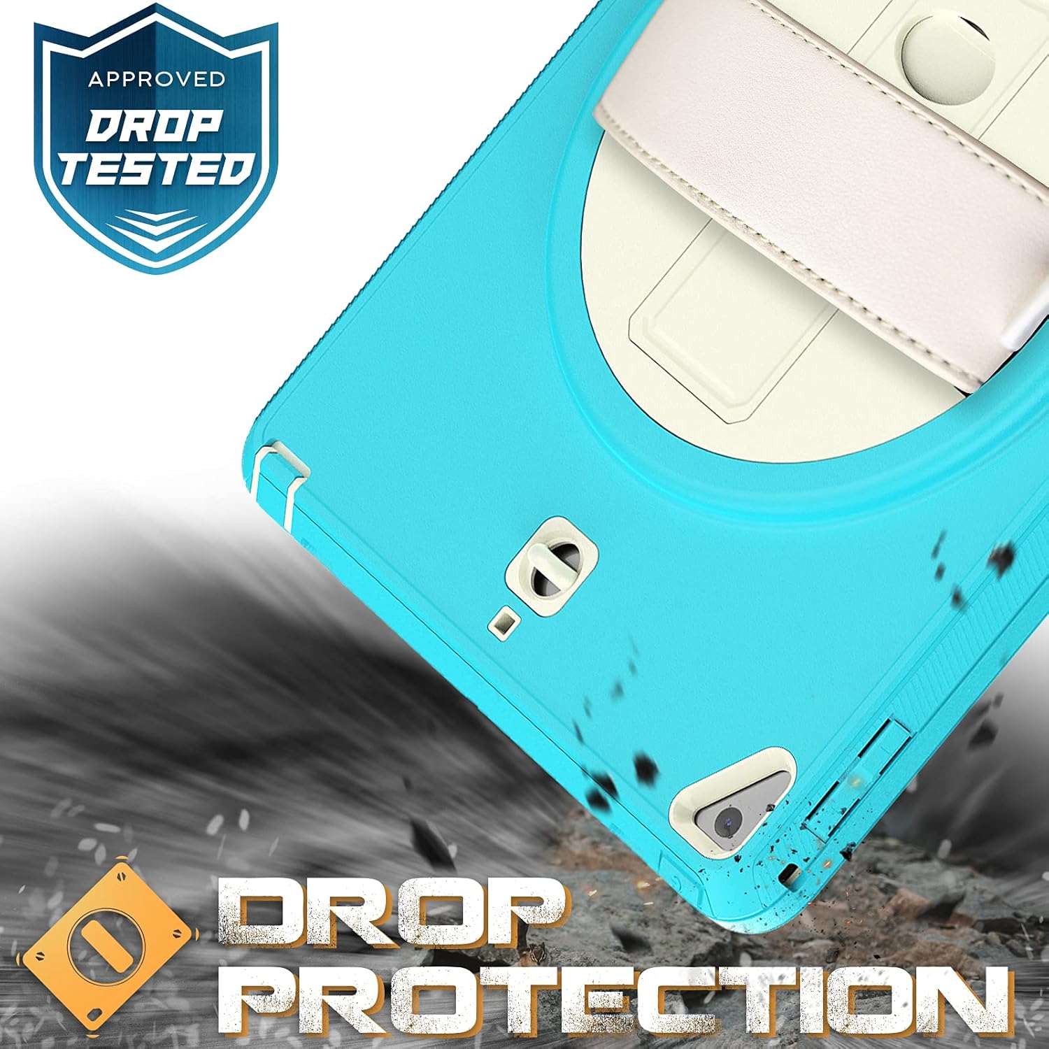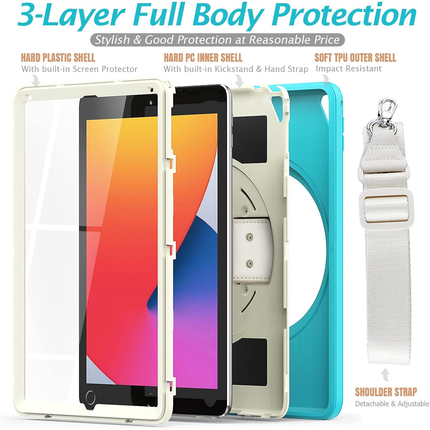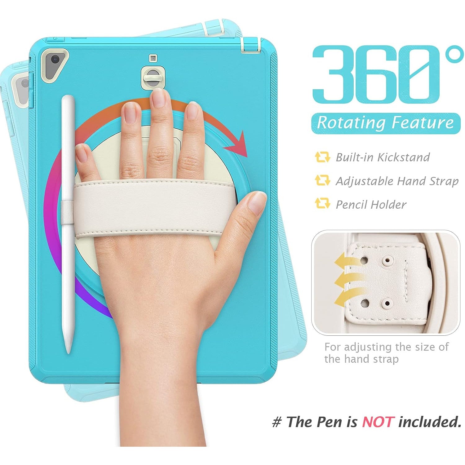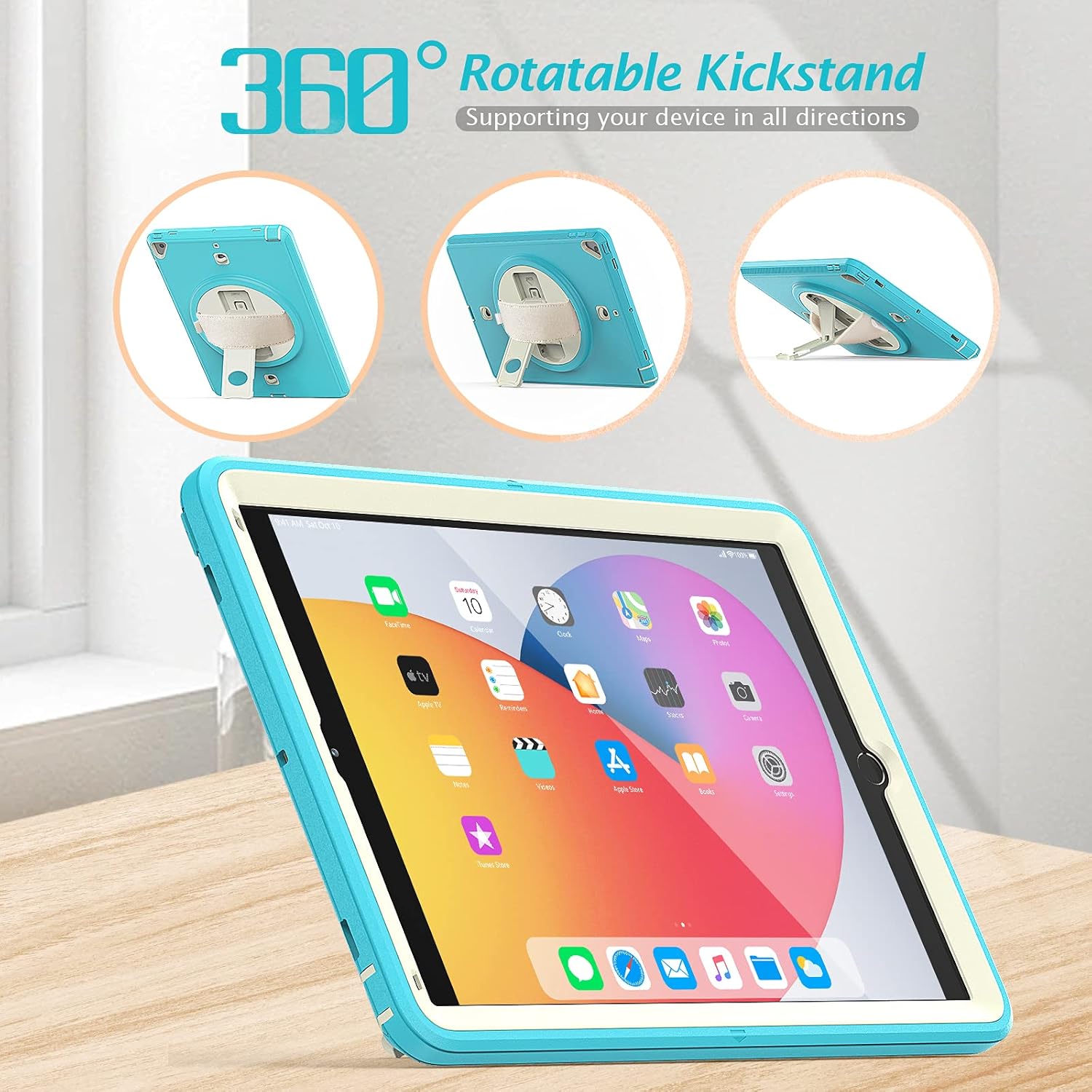 Pachet 360° pentru iPad 9.7" (iPad 5/6, Air 2, Pro 9.7) – Husa Sigloo Rugged cu Stand Rotativ, Folie Protectoare si Curea de Umar, Albastru cu Crem