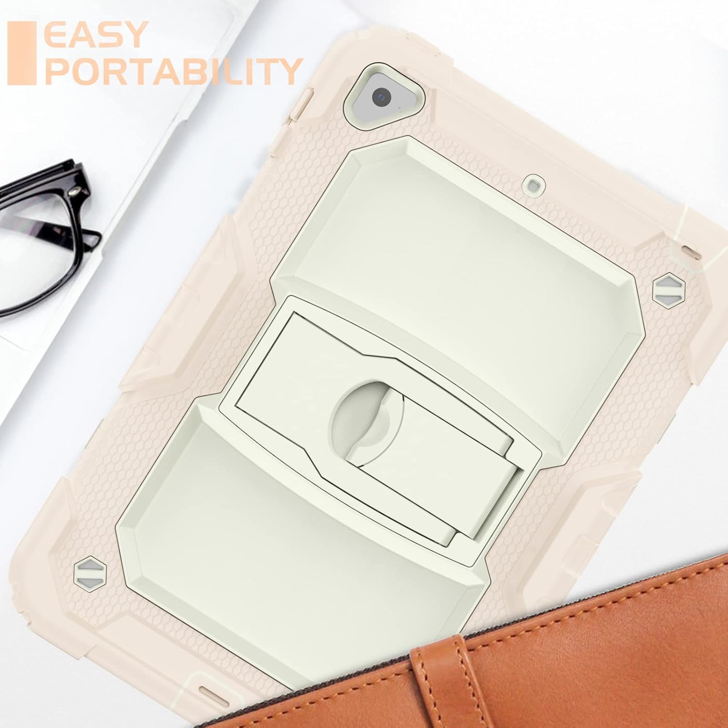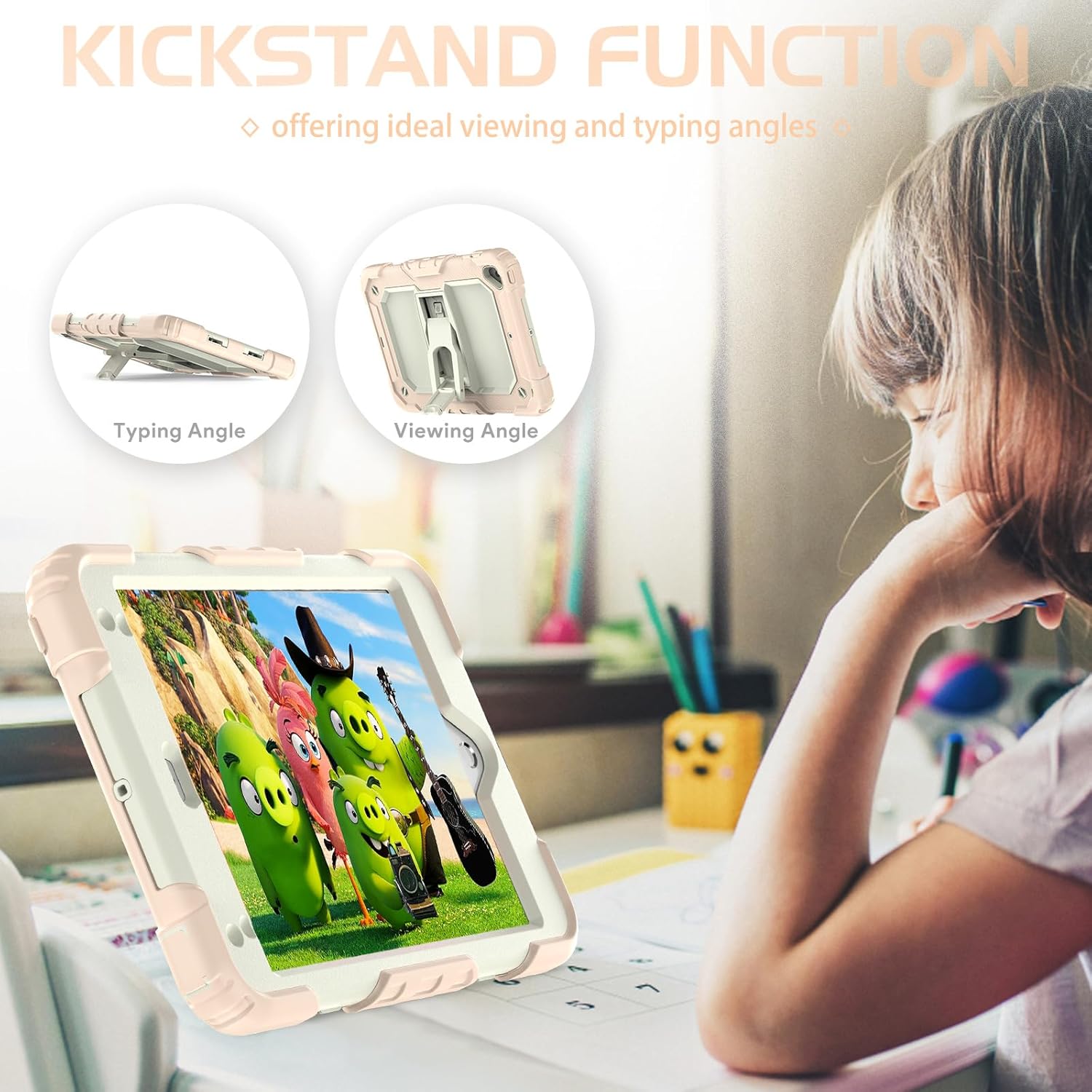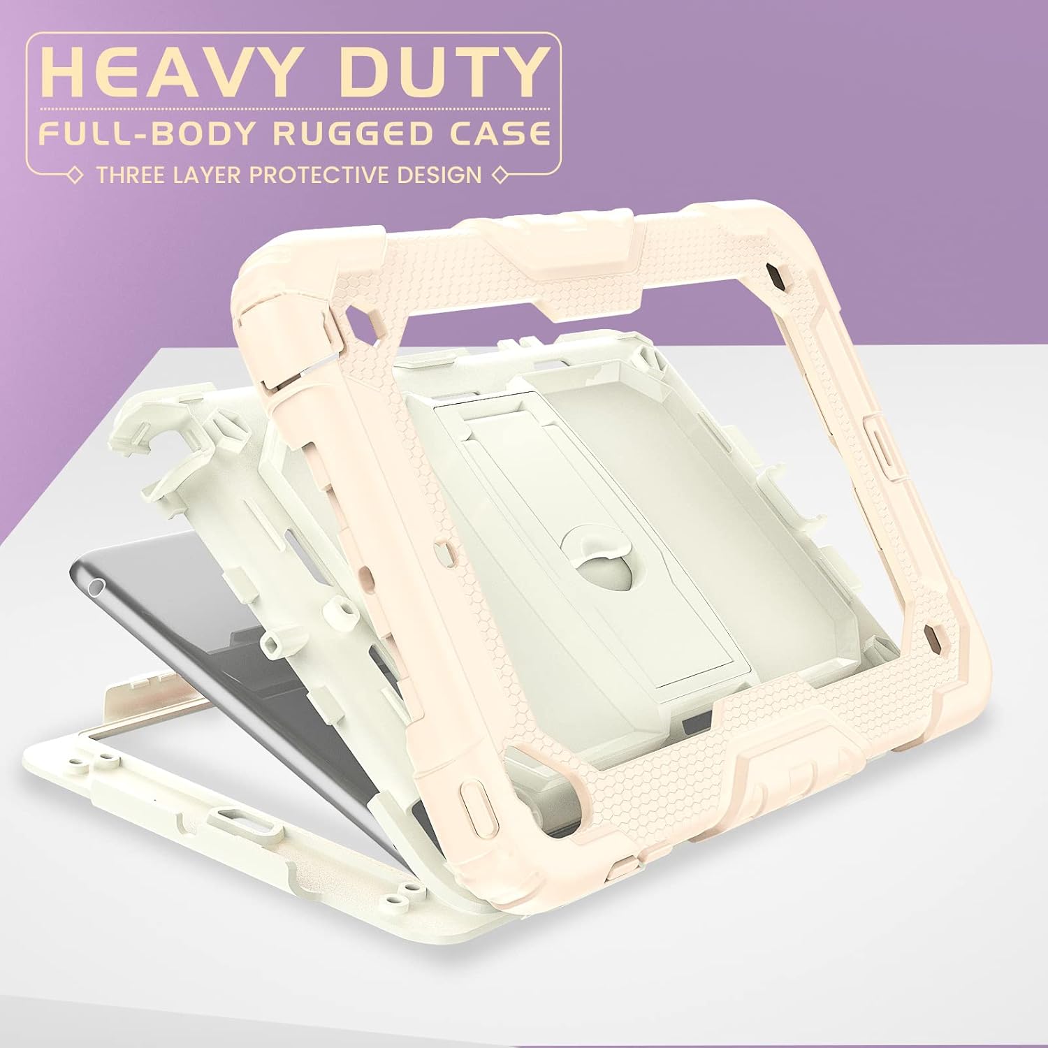Husa Sigloo pentru iPad 9.7" (iPad 5/6, Air 2, Pro 9.7) – 3 Straturi Protectie, Suport Integrat, Ecran Protejat, Antisoc –Roz cu crem