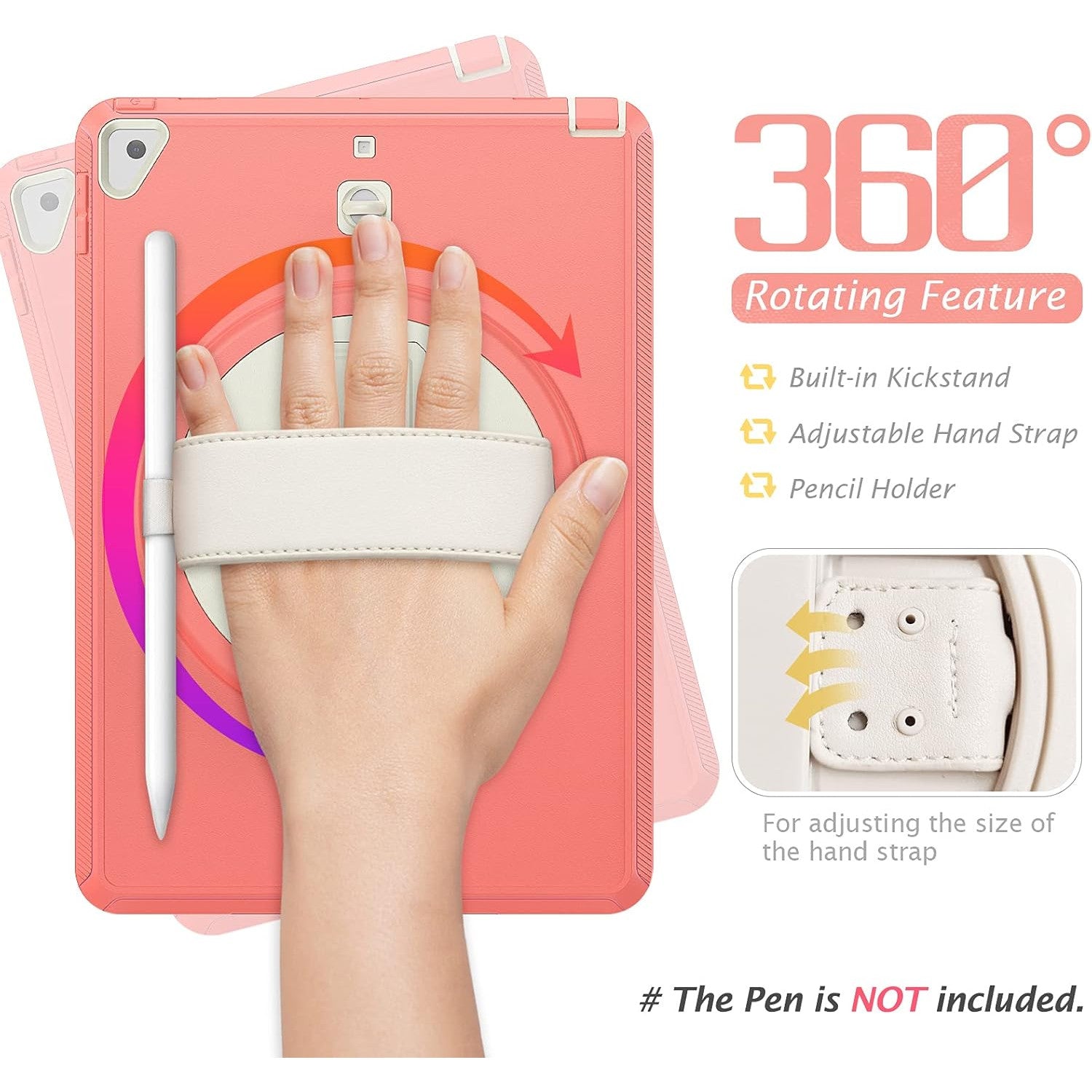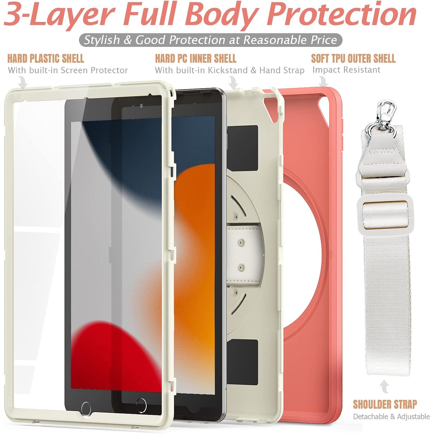 Pachet 360° pentru iPad 9.7" (iPad 5/6, Air 2, Pro 9.7) – Husa Sigloo Rugged cu Stand Rotativ, Folie Protectoare si Curea de Umar, Roz cu Crem