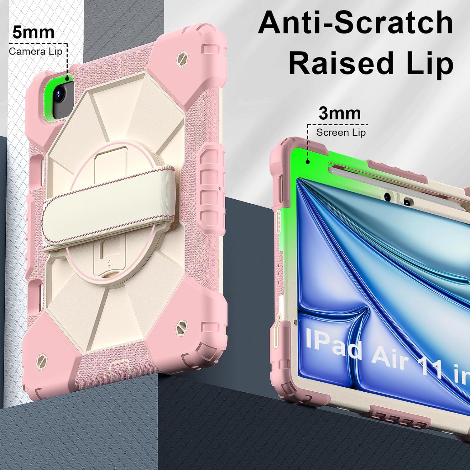 Husa rezistenta pentru iPad Air 11" (M2 2024 / Generatia 6), cu suport rotativ 360°, suport pentru stylus si curea de umar – Roz auriu
