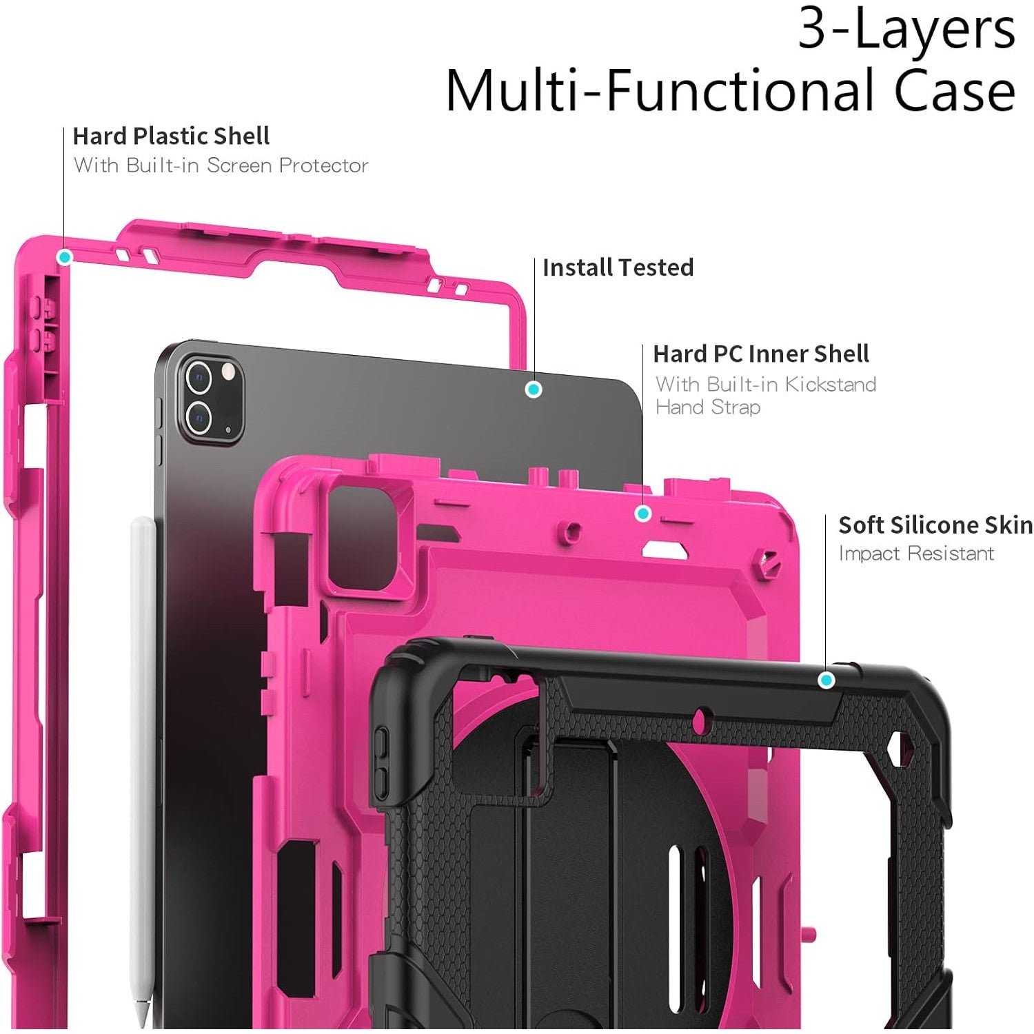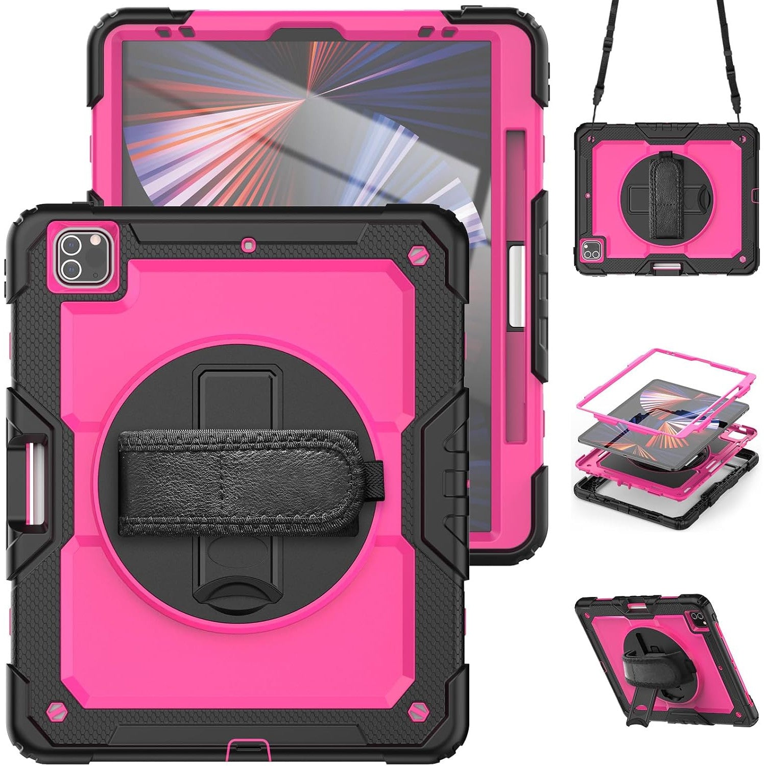 Pachet 360° pentru iPad Air 13 (2024/2025), iPad Pro 12.9" (2020/2021/2022) – Husa Sigloo Rugged cu Stand Rotativ, Folie Protectoare si Curea de Umar –Roz cu Negru