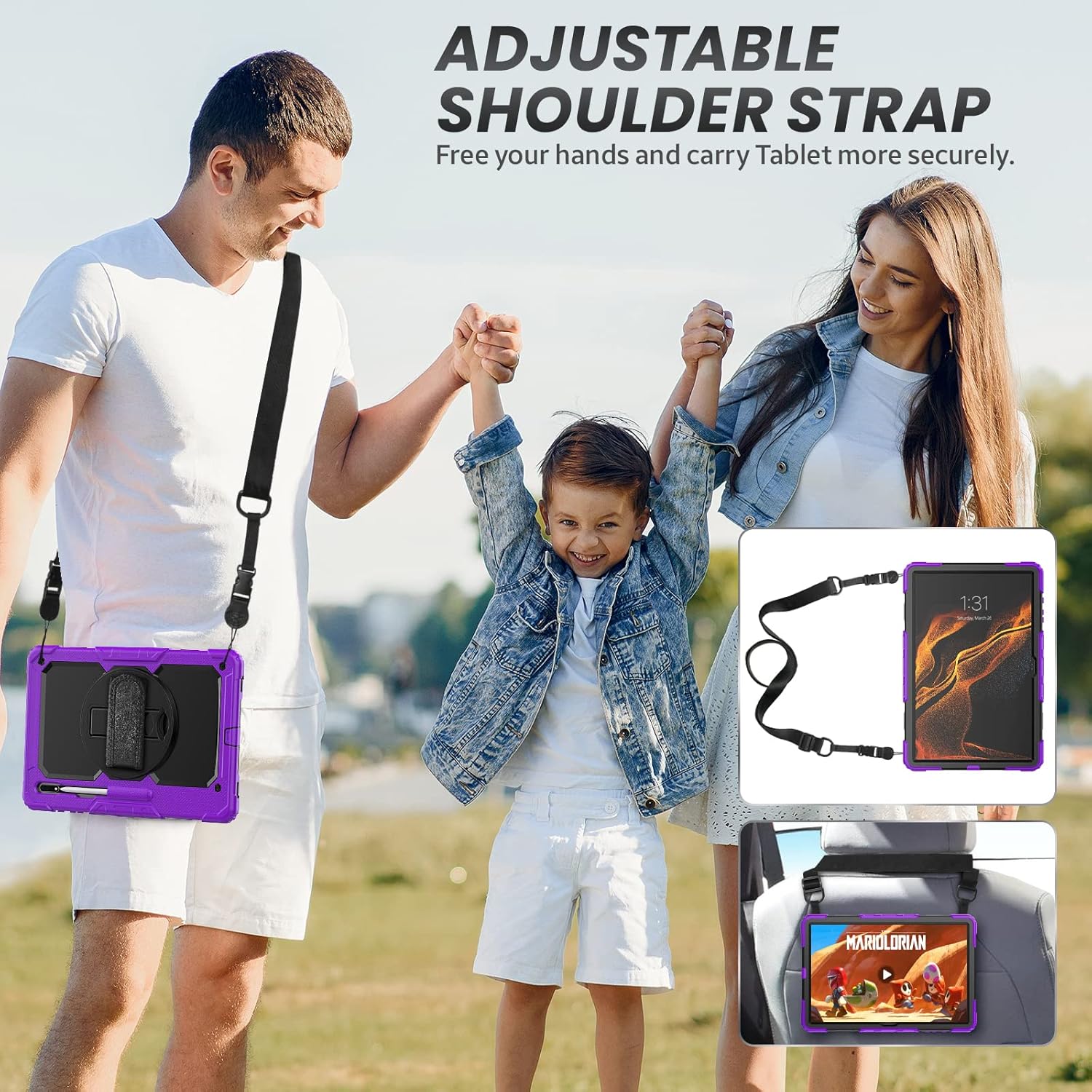Husa pentru Samsung Galaxy Tab S8 Ultra / Tab S9 Ultra / Tab S10 Ultra 14.6" – Carcasa 3-in-1 cu Protectie Militara, Suport Rotativ 360°, Maner Reglabil, Slot S-Pen, Curea de Umar + Folie de Ecran Inclusa – Mov cu negru
